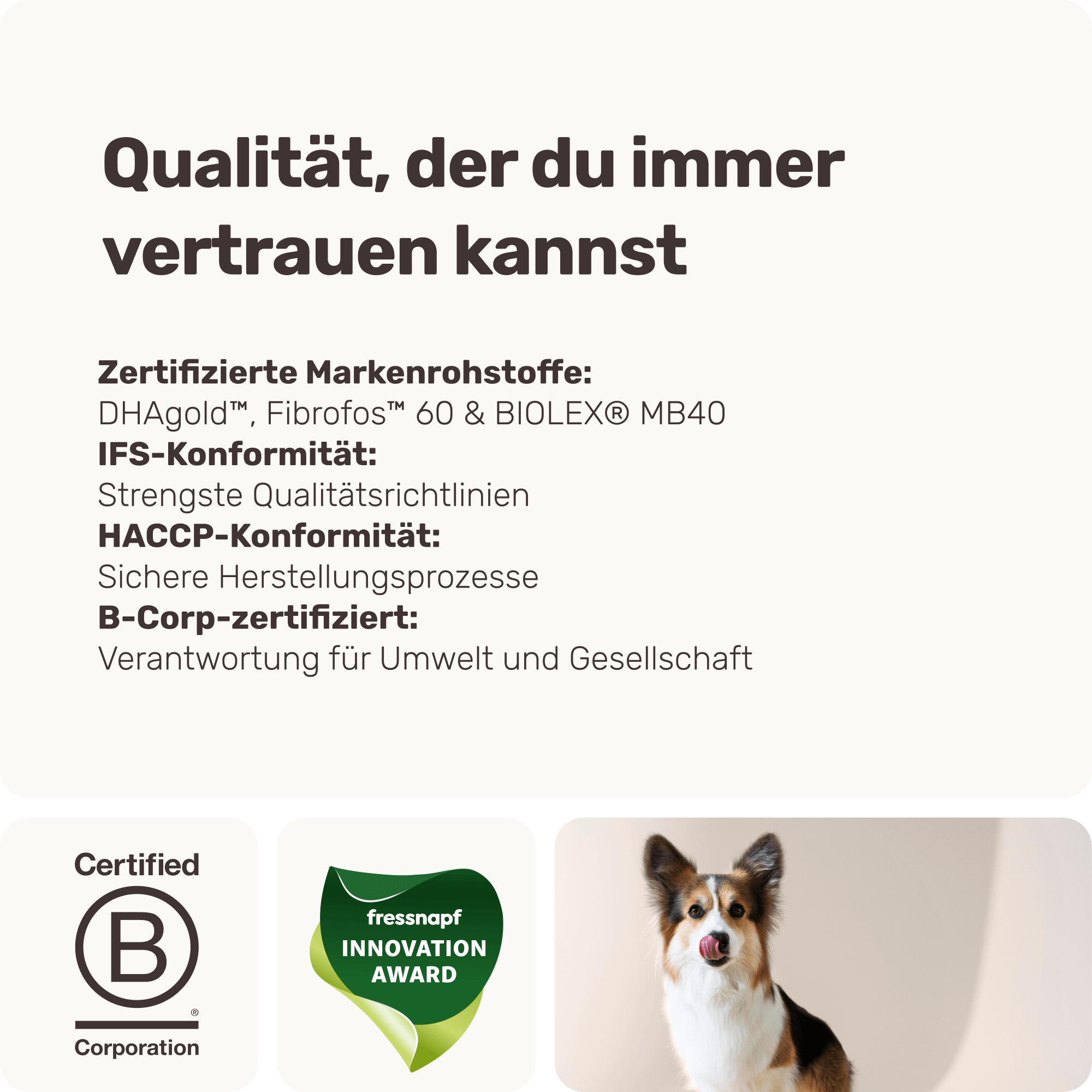 Wir stellen unsere Nahrungsergänzungen nach dem NoHeat-Verfahren her. Dabei wird schädliche Hitze vermieden und wertvolle Nährstoffe bleiben erhalten. Das Ergebnis: gesunde, saftige und unwiderstehlich leckere Supplements – perfekt für jeden Hund.