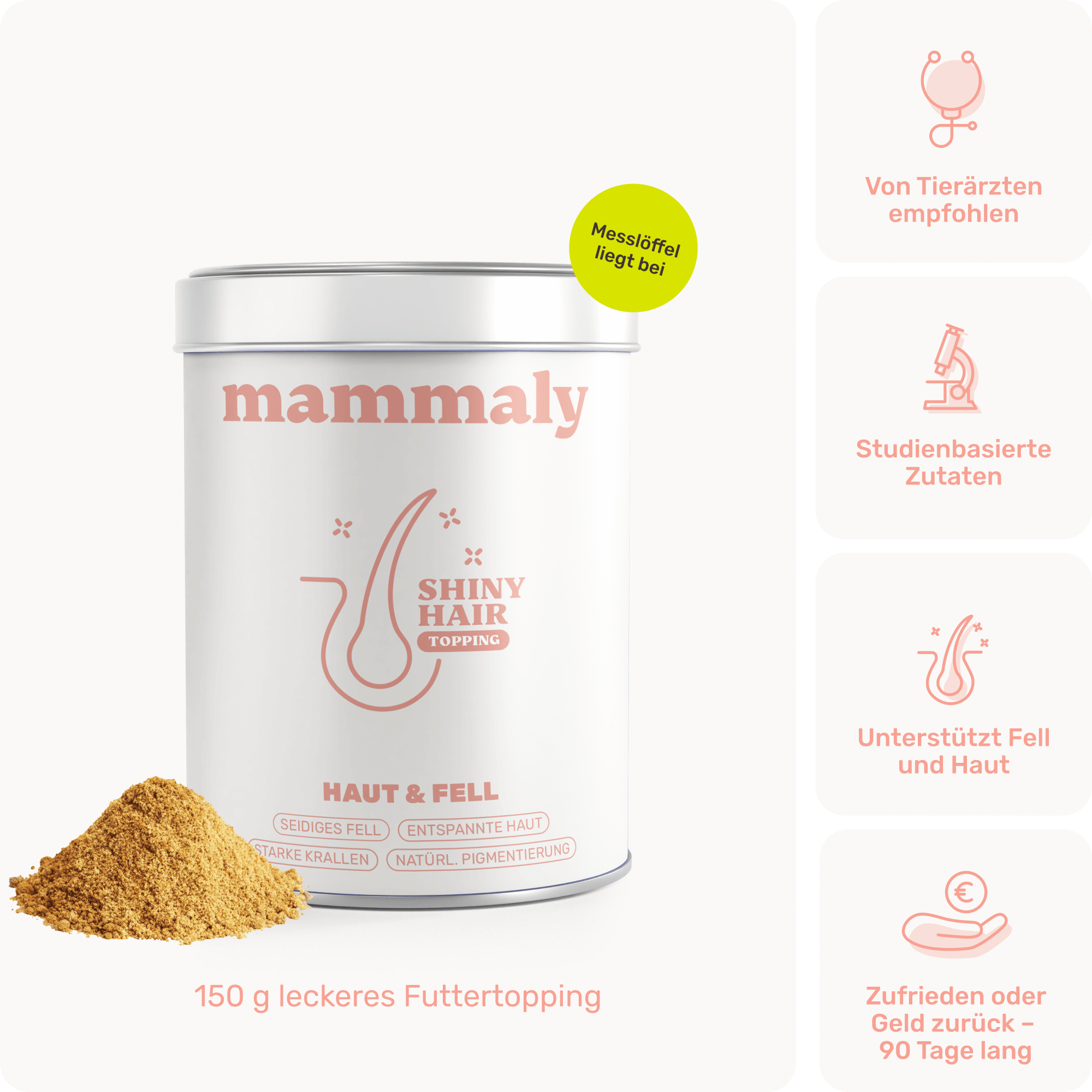 „Schönes glänzendes Fell, verbesserter Stuhlgang! Werde Mammaly weiter hin kaufen, auch mit der Lieferung bin ich sehr zufrieden.”